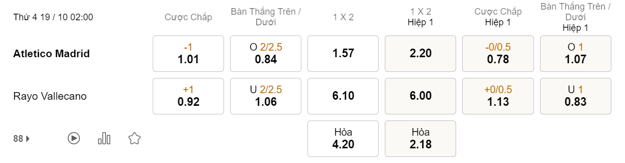 Soi kèo hiệp 1 Atletico Madrid vs Rayo Vallecano: 0.78*0/0.5*1.13