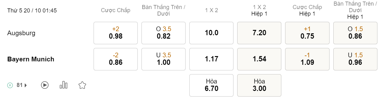 Soi kèo hiệp 1 Augsburg vs Bayern: 0.75*1*1.09