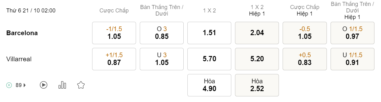 Soi kèo châu Á Barcelona vs Villarreal: 1.05*1/1.5*0.87