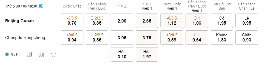 Tỉ lệ kèo Beijing Guoan vs Rongcheng