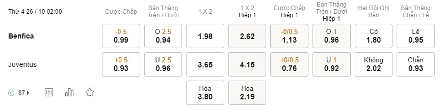 Tỉ lệ kèo Benfica vs Juventus