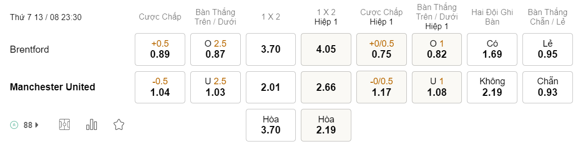 Soi kèo châu Á Brentford vs MU: 0.89*0.5*1.04