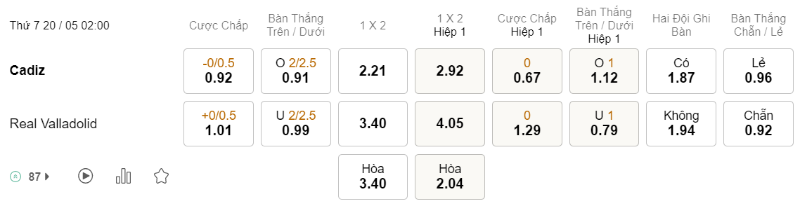 Soi kèo hiệp 1 Cadiz vs Valladolid: 0.67*0*1.29