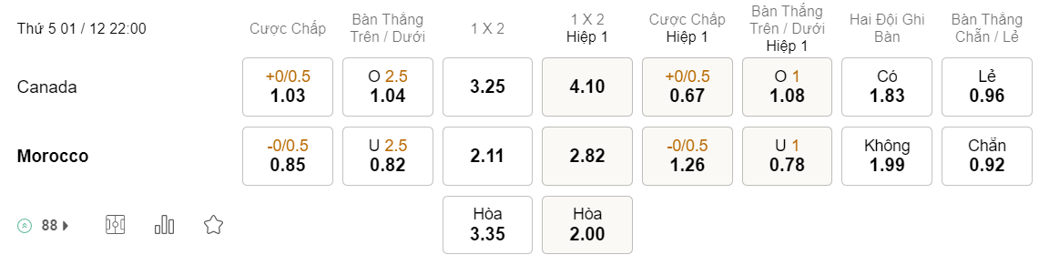 Soi kèo hiệp 1 Canada vs Morocco: 0.67*0/0.5*1.26