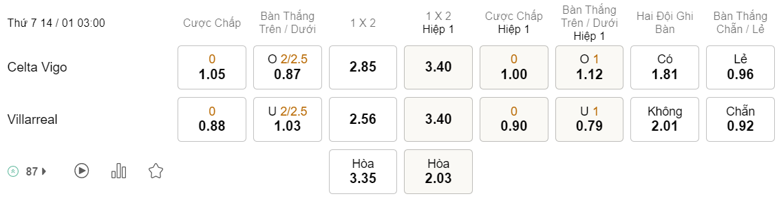 Soi kèo tài xỉu Celta Vigo vs Villarreal: 0.87*2/2.5*1.03