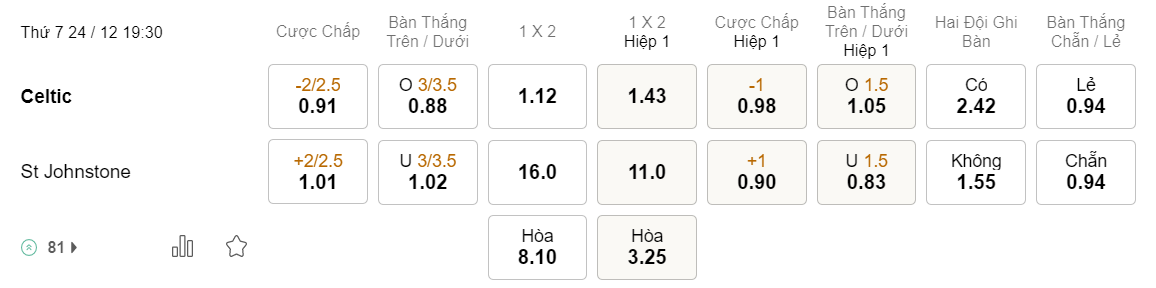 Soi kèo châu Á Celtic vs Johnstone: 0.91*2/2.5*1.01