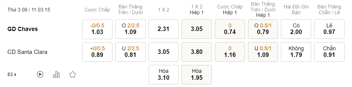 Soi kèo châu Á Chaves vs Santa Clara: 1.03*0/0.5*0.89
