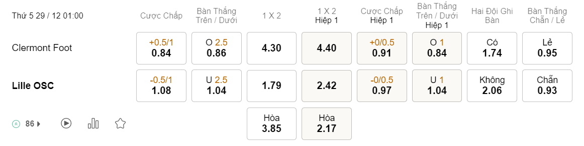 Soi kèo châu Á Clermont vs Lille: 0.84*0.5/1*1.08