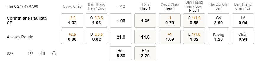 Tỉ lệ kèo Corinthians vs Always Ready