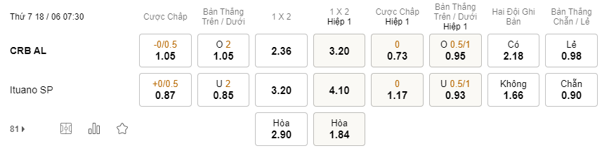 Như đã phân tích, tuy có phong độ cao nhưng CRB thường nhập cuộc thiếu chủ động. 5 trận đấu gần nhất, các học trò của Marcelo Cabo không thể ghi được bàn thắng trong 45 phút đầu tiên. Trong khi đó, Ituano lại thi đấu không quá tệ trong khâu phòng ngự, với việc có 3/4 trận đấu gần nhất, họ không bị thủng lưới trong hiệp 1. Do đó, khả năng cao 45 phút đầu tiên của trận đấu này sẽ khép lại mà không chứng kiến bàn thắng nào được ghi.