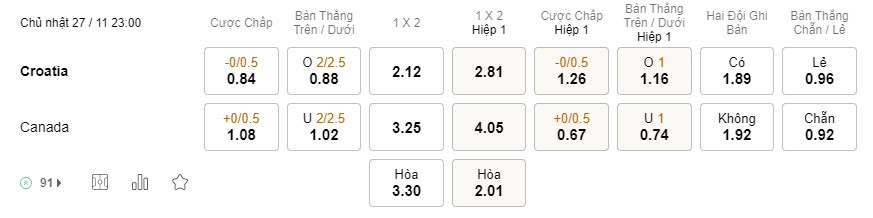 Tỉ lệ kèo Croatia vs Canada