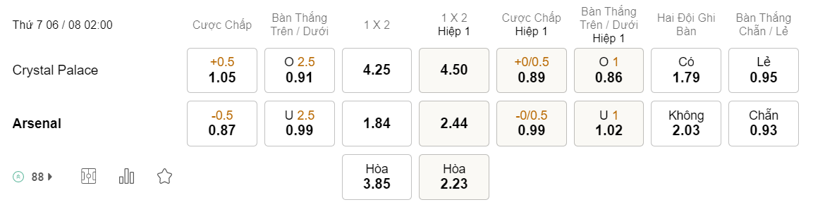 Tỉ lệ kèo Crystal Palace vs Arsenal