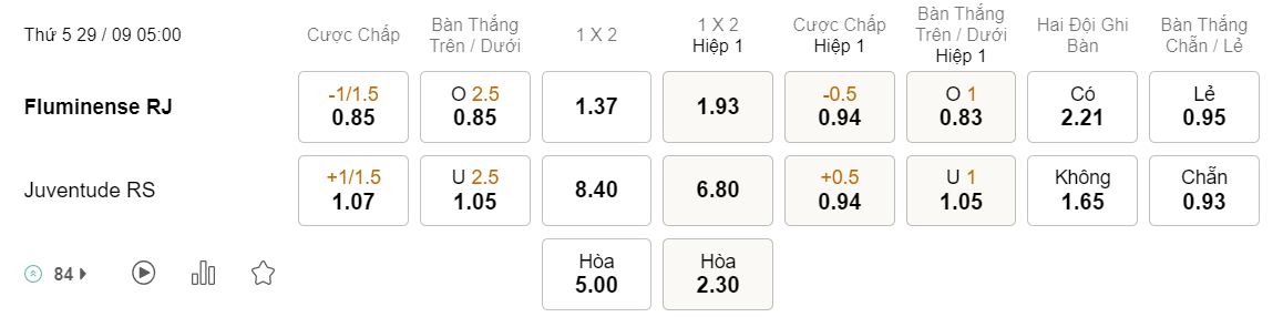 Cũng theo thống kê lịch sử đối đầu giữa hai đội, 4 lần gần nhất gặp nhau thì có tới 3 lần NHM của Fluminense và Juventude đã được chứng kiến bàn thắng tới ngay trong hiệp 1. Vì vậy các chuyên gia cho rằng, khả năng cao 45 phút đầu tiên của trận đấu này sẽ khép lại với ít nhất 1 bàn thắng cho đội chủ nhà.
