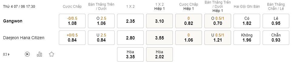 Soi kèo tài xỉu Gangwon vs Daejeon: 1.06*2.5*0.84