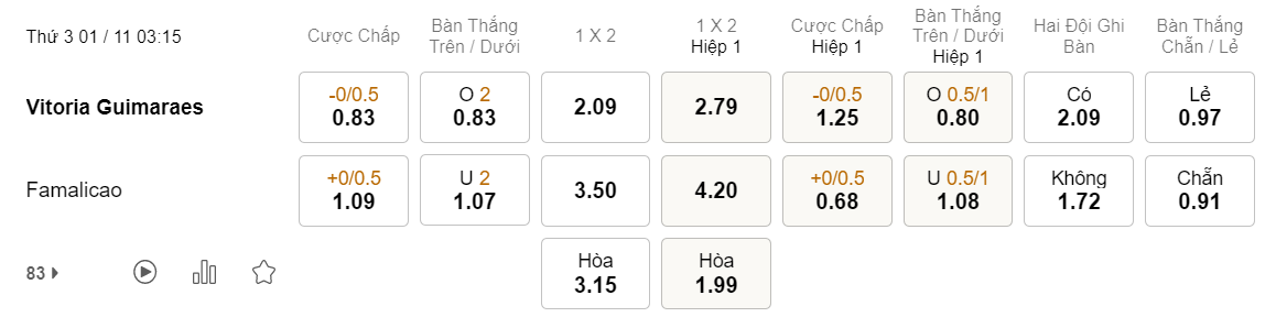 Soi kèo châu Á Guimaraes vs Famalicao: 0.83*0/0.5*1.09