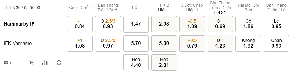 Soi kèo châu Á Hammarby vs Varnamo: 0.84*1*1.08