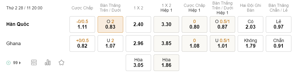 Tỉ lệ kèo Hàn Quốc vs Ghana