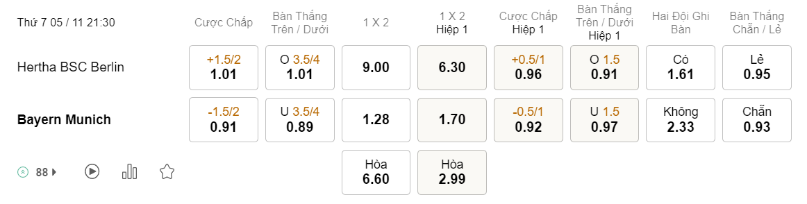 Soi kèo hiệp 1 Hertha Berlin vs Bayern: 0.96*0.5/1*0.92