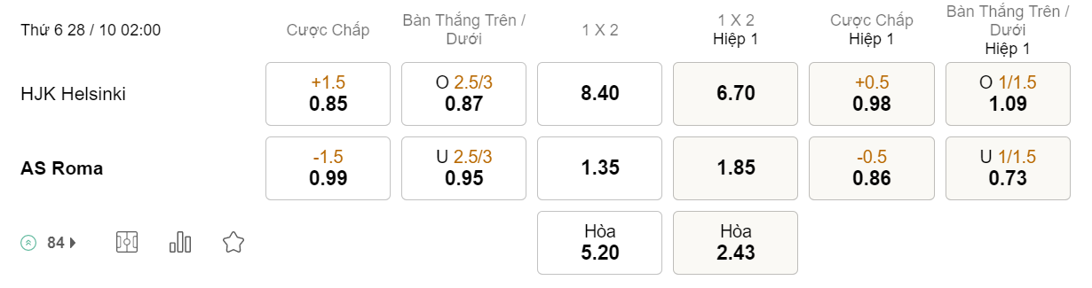 Soi kèo châu Á HJK vs Roma: 0.85*1.5*0.99