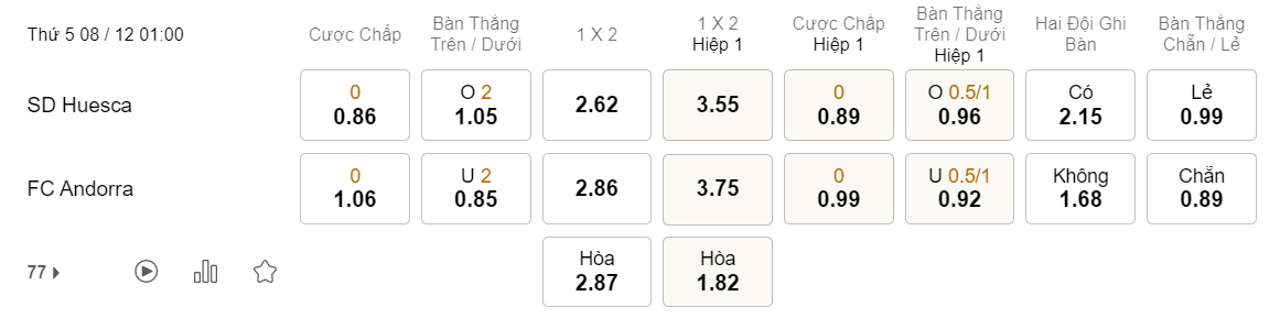 Tỉ lệ kèo Huesca vs Andorra