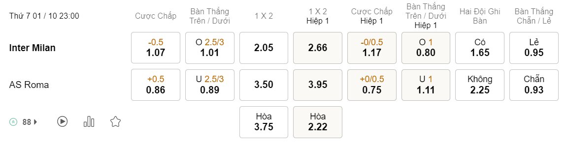 Soi kèo hiệp 1 Inter vs Roma: 1.17*0/0.5*0.75