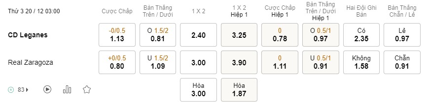 Tỉ lệ kèo Leganes vs Zaragoza