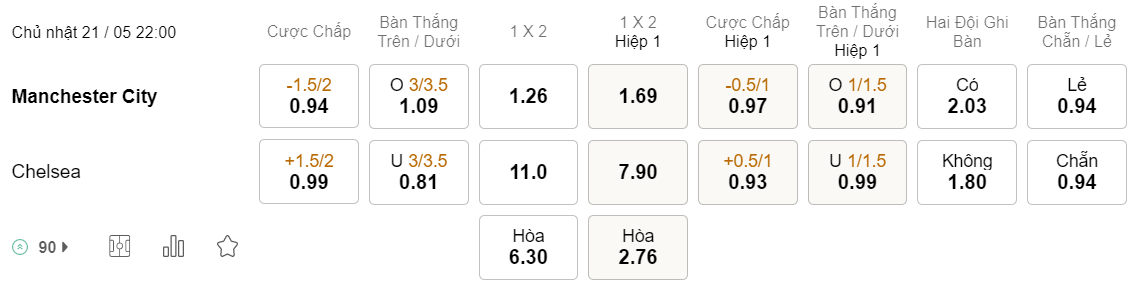 Tỉ lệ kèo Man City vs Chelsea