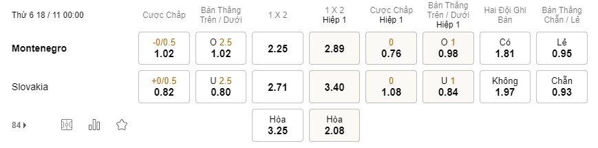 Soi kèo hiệp 1 Montenergo vs Slovakia: 0.76*0*1.08