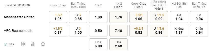 Soi kèo hiệp 1 MU vs Bournemouth: 1.06*0.5/1*0.82