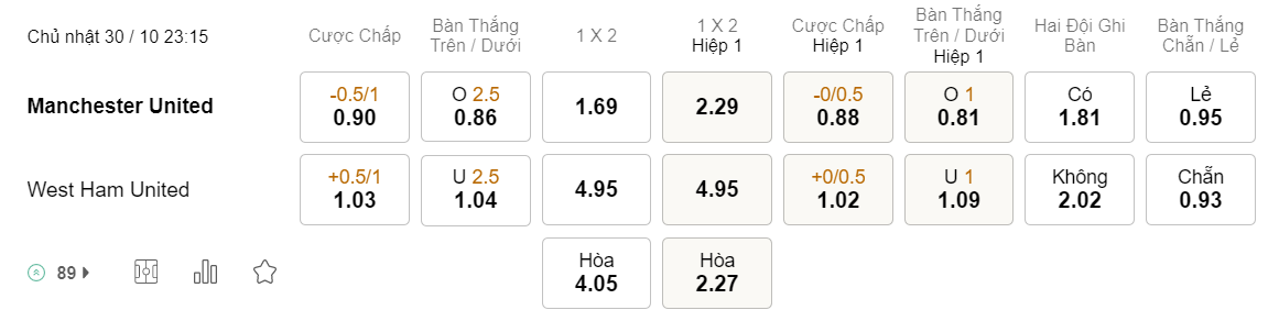 Soi kèo hiệp 1 MU vs West Ham: 0.88*0/0.5*1.02