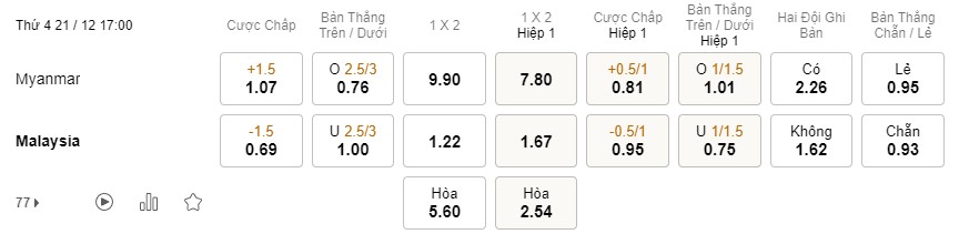 Tỉ lệ kèo Myanmar vs Malaysia