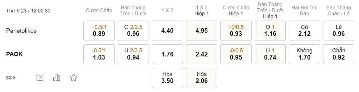 Soi kèo châu Á Panetolikos vs PAOK: 0.89*0.5/1*1.03