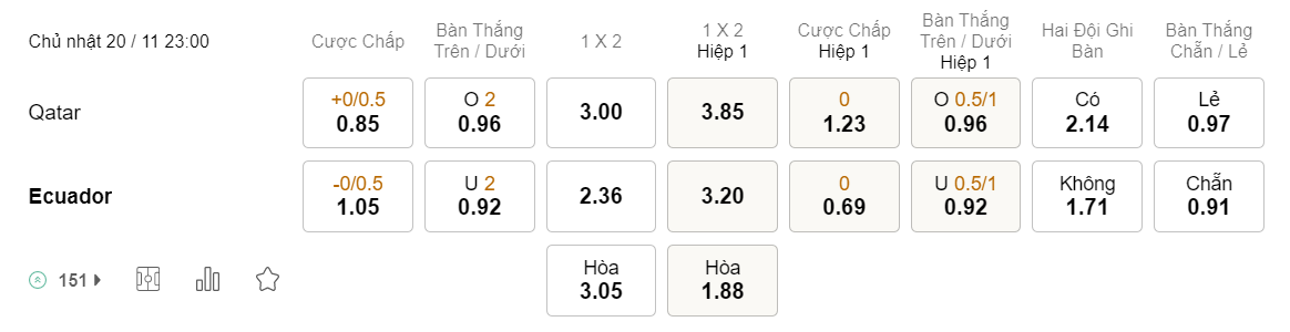Soi kèo hiệp 1 Qatar vs Ecuador: 1.23*0*0.69