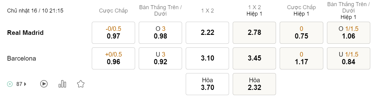 Tỉ lệ kèo Real Madrid vs Barcelona