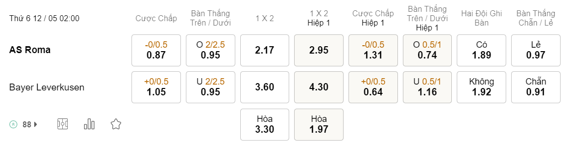 Soi kèo tài xỉu Roma vs Leverkusen: 0.95*2/2.5*0.95