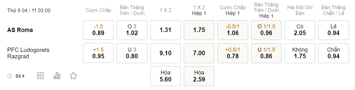 Tỉ lệ kèo Roma vs Ludogorets
