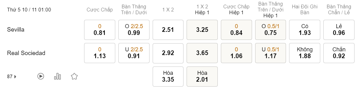 Soi kèo hiệp 1 Sevilla vs Sociedad: 0.84*0*1.06