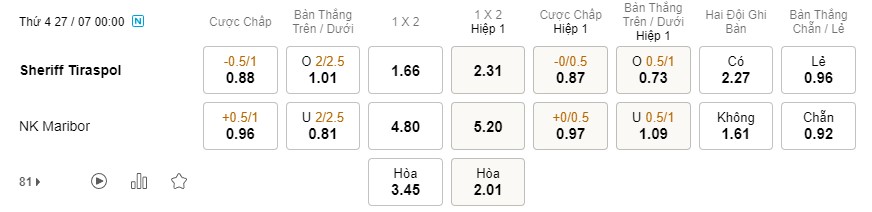 Soi kèo hiệp 1 Sheriff vs Maribor: 0.87*0/0.5*0.97