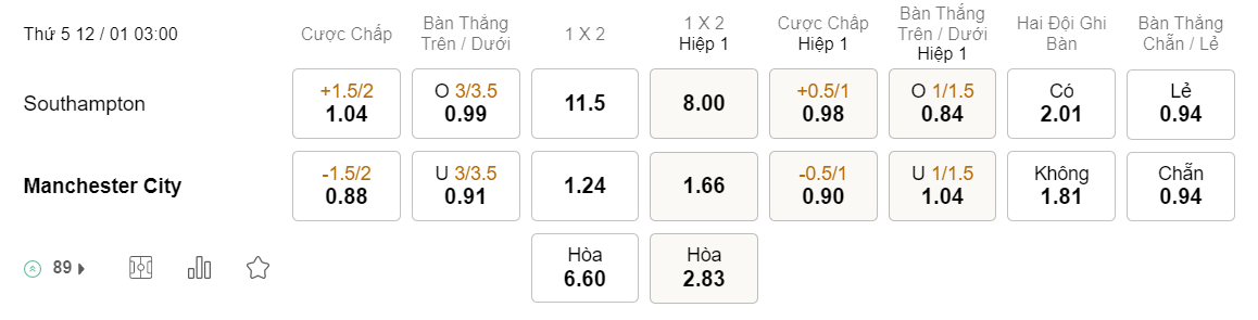 Soi kèo châu Á Southampton vs Man City: 1.04*1.5/2*0.88