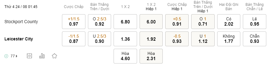 Theo thống kê, có tới 2/3 trận gần nhất Stockport và Leicester đối đầu nhau, NHM đã được chứng kiến bàn thắng tới sớm ngay trong hiệp 1. Vì vậy, khả năng cao 45 phút đầu tiên của cuộc đối đầu này sẽ khép lại với một kết quả dẫn trước cho đội bóng được đánh giá cao hơn hẳn là Leicester.