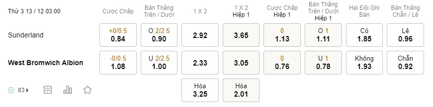 Tỉ lệ kèo Sunderland vs West Brom