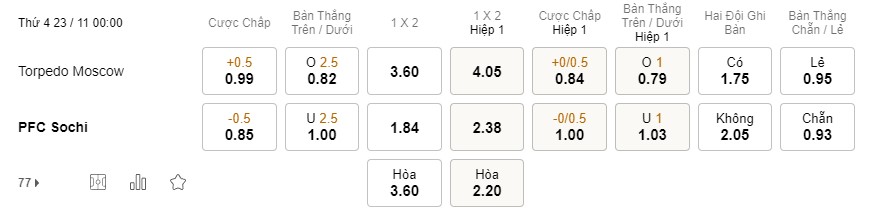 Soi kèo hiệp 1 Torpedo Moscow vs Sochi: 0.84*0/0.5*1.00