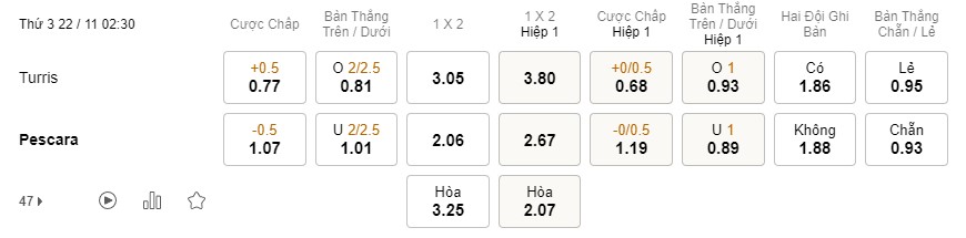 Soi kèo châu Á Turris vs Pescara: 0.77*0.5*1.07