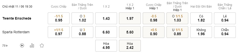 Soi kèo châu Á Twente vs Sparta Rotterdam: 0.95*1/1.5*0.97