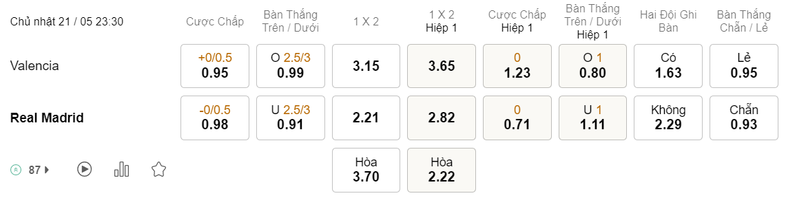 Soi kèo hiệp 1 Valencia vs Real Madrid: 1.23*0*0.71