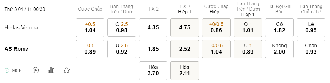 Soi kèo châu Á Verona vs Roma: 1.04*0.5*0.89