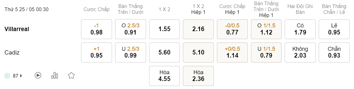 Soi kèo hiệp 1 Villarreal vs Cadiz: 0.77*0/0.5*1.14