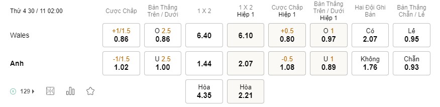Soi kèo châu Á Wales vs Anh: 0.86*1/1.5*1.02